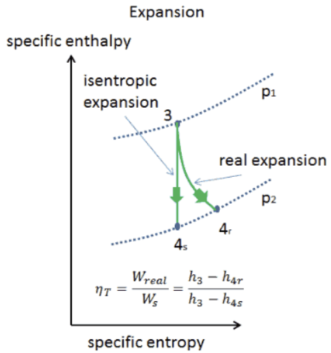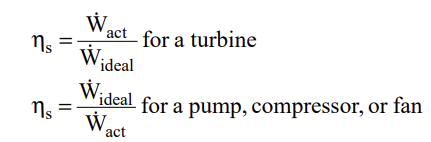 isentropic efficiency가 100%라는 것은 에너지 손실이 없는 것을 의미하지만 실제 compressor나 터빈의 설계와 운전조건에 따라 보통 70~90% 범위이며, 터빈은 isentropic시의 work output에 대한 실제 work output의 비율이고, compressor는 isentropic압축시 요구되는 work에 대한 실제 work inout의 비율이다.