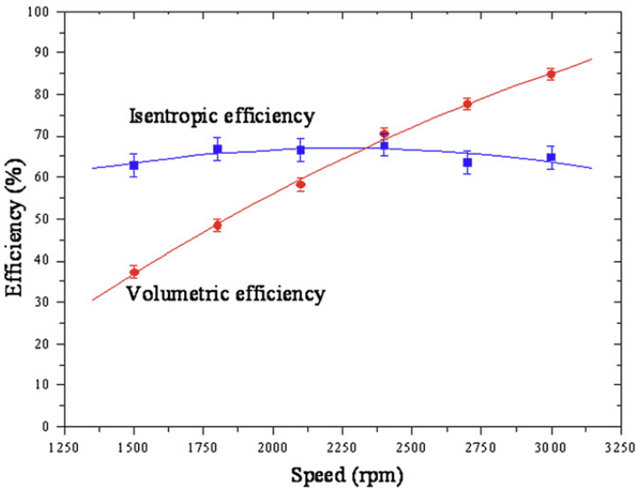 compressor의 isentropic efficiency는 isentropic 공정시의 work input과 실제 work input과의 관계이며, 이는 최소의 loss로 이론적인 최대의 압축을 달성하는 compressor의 성능을 알 수 있는 정보를 제공하며, 주로 air conditioning, refrigeration, natural gas processing분야에서 가스 압축 분석시 주로 이용된다.