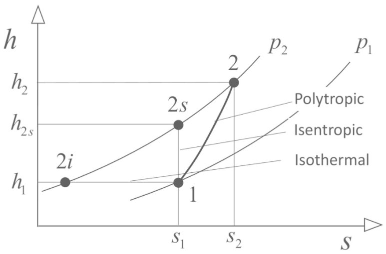 일반적으로 열역학 계산은 이상적이며 가역공정에 대해 진행하고 그 결과에 대해 효율의 개념을 적용하여 실제 공정에 활용하게 된다. 압축공정은 3개의 이상적인 공정이 있는데, isothermal, isentropic, polytropic process이다. 이들 중 하나의 process를 통해 필요로 하는 power를 계산하고 outlet온도를 예측할 수 있다. 이중 isothermal process의 경우 실제 압축시 동일한 온도에서 진행되지 않기 때문에 basis로서 거의 사용되지 않는다.