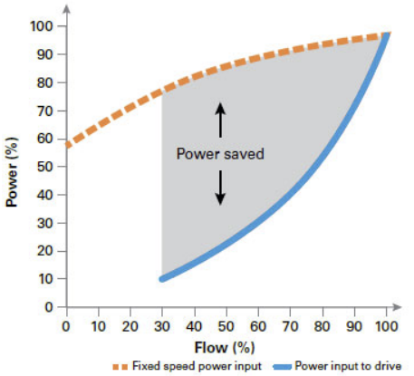 즉, 에너지 비용을 줄이기 위해 pump의 speed를 20% 줄일 경우 에너지 saving을 50%까지 할 수 있다. 아울러, impeller 마모를 줄이기 위해 펌프를 천천히 start할 수 있으며, pump를 stop할 때에도 speed를 낮추어 후단 check valve의 smooth close를 통해 maintenance를 줄일 수 있다. built-in PID controller를 통해 압력이나 유량, 액위 등을 원하는 수준에서 유지할 수 있다.