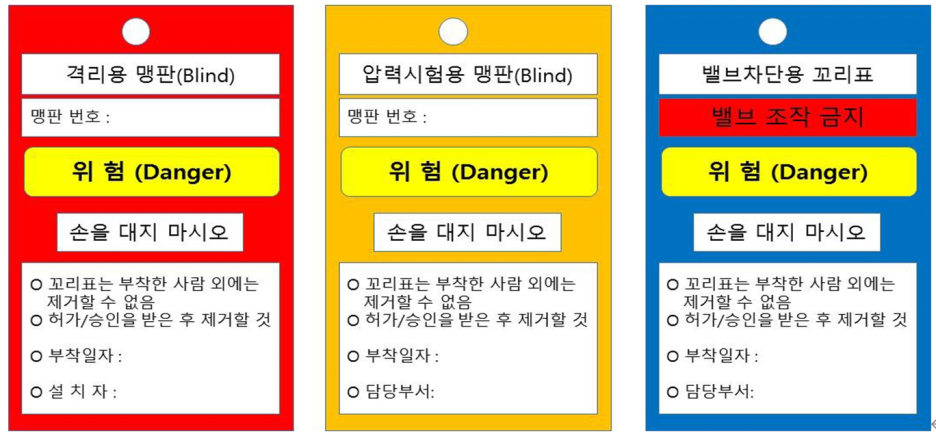 맹판을 설치한 경우에는 반드시 꼬리표를 부착하여야 하며, 맹판을 설치할 수 없는 경우에는 관련부서가 참여하는 작업 위험성평가를 실시하여 대책을 마련한다.