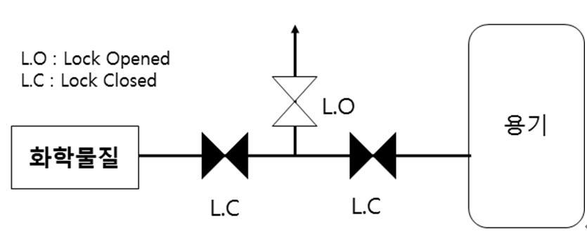 밸브에 의한 격리는 격리되지 않은 것으로 간주한다. 다만, 아래와 같이 밸브 2개를 직렬로 차단한 상태로 잠금장치와 꼬리표를 부착하고, 2개 밸브 사이의 벤트밸브를 개방하여 잠금장치와 꼬리표를 부착하는 경우에는 격리된 것으로 볼 수 있다. 이 경우에는 첫 번째 밸브가 누설될 경우에 개방된 밸브를 통해 배출될 수 있다.
