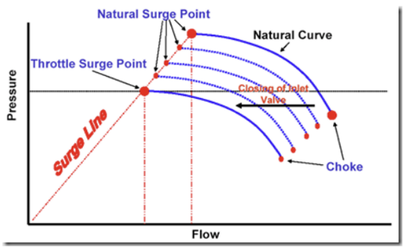 Centrifugal compressor에서의 throttle surge는 후단에서의 일정한 압력은 유지하지만 유량이 surge line까지 감소할 때 발생되며 이를 방지하기 위해 surge point에 도달되기 전에 bypass valve를 open하여 compressor를 통한 흐름을 유지해야 한다. 아울러 natural surge라는 개념은 compressor가 낼 수 있는 가장 높은 압력을 초과하는 것이며 주로 rated pressure의 110%를 감안하다.