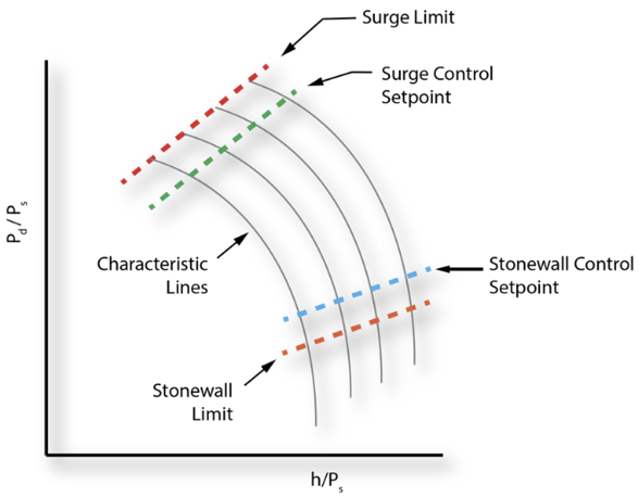 Surge를 방지하는 기술과 유사하게, stonewall 예측 알고리즘은 압축비를 계산하여 주어진 유량에서의 stonewall이 발생되는지를 예상하며, stonewall현상으로부터 약간의 운전 마진을 고려하여 stonewall controller set point를 설정하므로서 적기에 지나친 흐름을 방지할 수 있다.