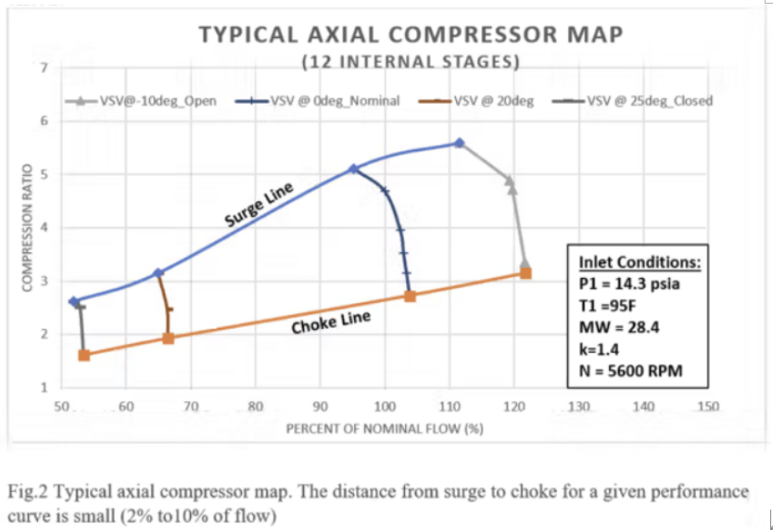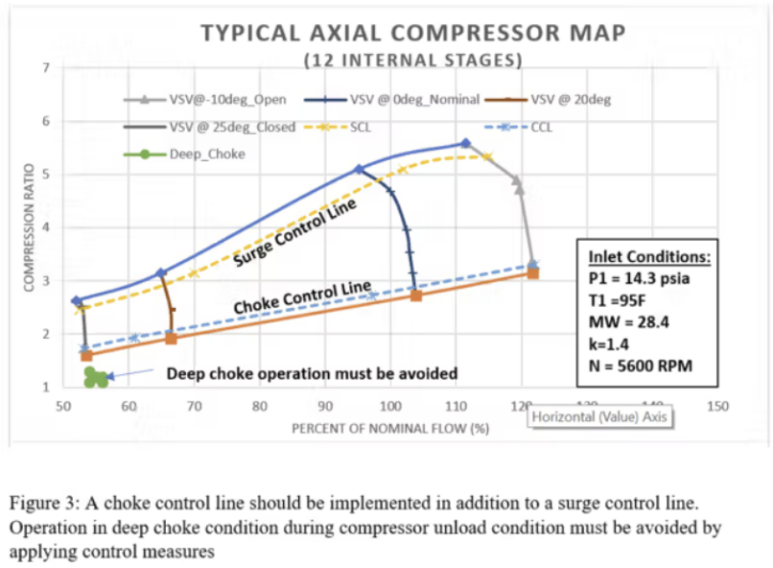 Axial compressor에서는 위 그래프처럼 surge와 choke사이의 거리가 매우 짧다. 즉, 압축 stage가 증가할수록 압축비도 증가하지만 surge와 choke사이의 운전 마진은 감소한다. 일반적인 진동측정장치로 choke를 감지하기에는 쉽지 않아 axial compressor의 경우 deep choke를 인지하지 못한 채 unloaded 조건에서 오랫동안 운전이 될 수 있다.