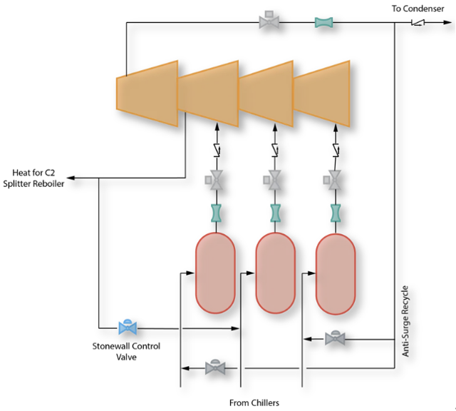 에틸렌 플랜트내 4단 propylene 냉동 컴프레서의 세번째 단 후단으로부터 side draw가 있으며 여기에서 extraction된 가스는 C2 splitter의 reboiler heat source로 사용된다. 만약 start-up시 C2 splitter reboiler로의 유량이 줄 경우 네번째 stage은 stonewall condition으로 pushing되며 세번째 stage는 surge상태가 될 수 있다.