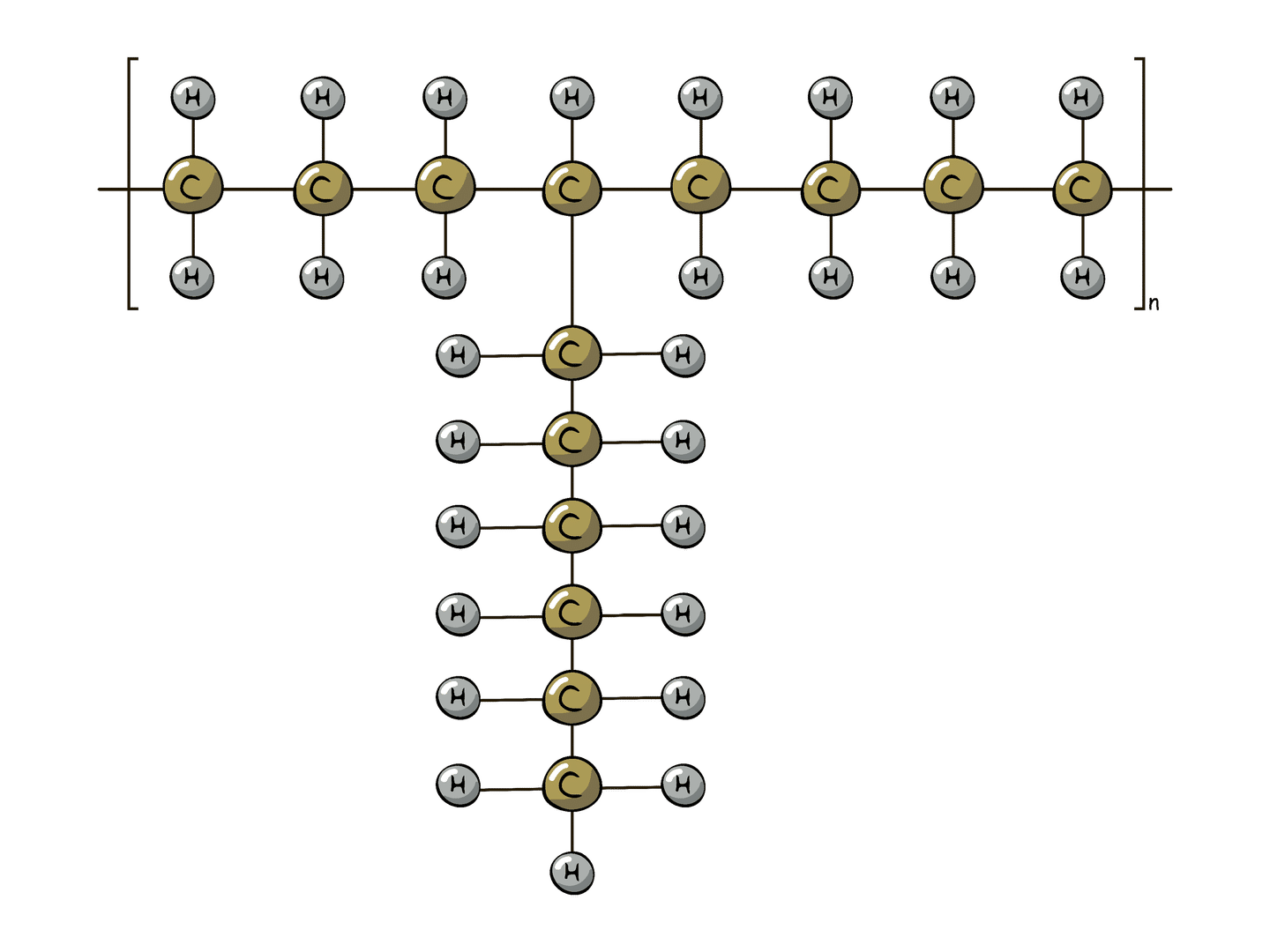 2개의 에틸렌 분자가 중합중인 polymer의 동일한 곳에 join할 때 chain에 branch가 생성될 것이다. 따라서 PE는 단순한 long chain이 아니라 많은 짧은 chain과 긴 branch로 구성된다. 이처럼 다양한 chain, branch로 구성됨에 따라 분자량 측정 index인 MFR (melt flow rate), 분자들의 밀집도를 측정하는 index인 밀도, MWD (molecular weight distribution)로 인해 PE의 물성치에 영향을 준다.