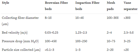 Standard mesh type일 경우 3~15마이크론 입자 크기에 대해 99.9%의 분리효율을 갖고 있으며, wire직경은 0.15~0.274mm이며 type에 의존하는 specific surface는 90~1,120m2/m3 범위이며, pad를 support하는 grid는 free inflow area가 90%이상이 되도록 설계한다.