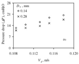 이전 그래프는 공통적으로 superficial gas velocity에 대한 demister를 통한 압력 강하가 증가하고 있음을 보여준다. 유속이 낮을 때 보다 작은 입자들은 disengagement zone을 통해 가스에 동반되지만 보다 큰 입자들은 reservoir로 settle되어 demister에서의 liquid holdup은 줄어든다. 하지만 가스 유속이 증가하면 중력에 의해 떨어지는 droplet을 가스흐름에 동반되게 되어 결국 demister에서 liquid holdup이 증가하여 가스흐름을 위한 free space area가 줄며 동시에 압력 강하가 증가하게 된다.