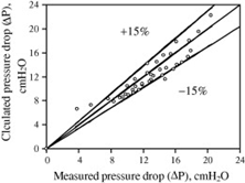하지만 위 식에서 보는 것처럼 surface area, void fraction, wire diameter의 영향은 packing density와 superficial gas velocity에 비해 minor하다. 실측된 압력 강하와 상관 관계식을 통해 계산된 값과의 비교는 아래와 같고 결과적으로 ± 15%의 accuracy하에서 상관 관계식을 적용할 수 있다.