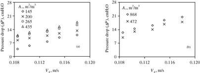 specific surface area가 증가하면 압력 강하가 커진다. Specific surface area (m2/m3)는 demister volume에 대한 wire의 표면적이다. 표면적의 증가는 packing밀도와 관련이 된다. 따라서 packing 밀도가 커짐에 따라 wire에 captured droplet들이 많아진다. 그래서 응집된 액체들로 인해 가스 흐름의 free space가 감소하게 되어 demister surface area가 증가할수록 압력강하가 커지는 것을 알 수 있다. 아래 표를 통해 demister 압력강하는 specific surface area가 클수록 그리고 superficial gas velocity가 클수록 커진다.