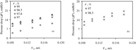 Void fraction (ɛ)은 전체 부피에 대한 demister 간극 (공간)의 부피로 정의되며 demister 간극의 부피는 전체 demister 부피에서 wire가 점유하는 부피를 뺀 값이다. 가스 속도에 대한 각 void fraction (free volume)에서의 압력 강하를 보여준다. Void fraction이 감소할수록 압력강하가 증가함을 보여준다. 이는 vacancy volume이 줄어들고 즉 가스 흐름에 대한 free space가 줄어 흐름에 대한 저항의 증가를 야기하여 압력 강하가 증가한 것이다.