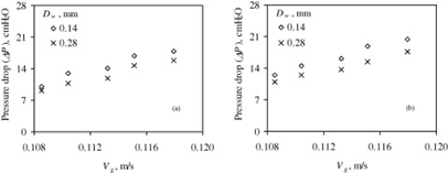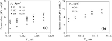 예를 들어 아래 표를 보면 superficial gas velocity가 0.113m/s까지는 선형으로 압력 강하가 증가하지만 그 이후 (loading point)부터는 기울기가 더 커져 superficial gas velocity증가에 따라 압력 강하는 더 커진다.