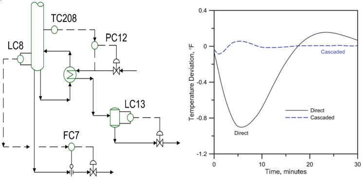 다만 cascade는 추가되는 계기로 인해 투자비는 증가하지만 전체적인 시스템 안정성을 통한 제품 성능을 만족하도록 운전되므로 그 이상의 효과가 있다. 다만 LC13처럼 직접 제어하는 경우 증류탑 조성 변화나 스팀 압력 변화, 스팀 유량의 변화 혹은 condensate 배압과 같은 외란의 변화가 일어날 경우 level control에 영향을 주게 된다.