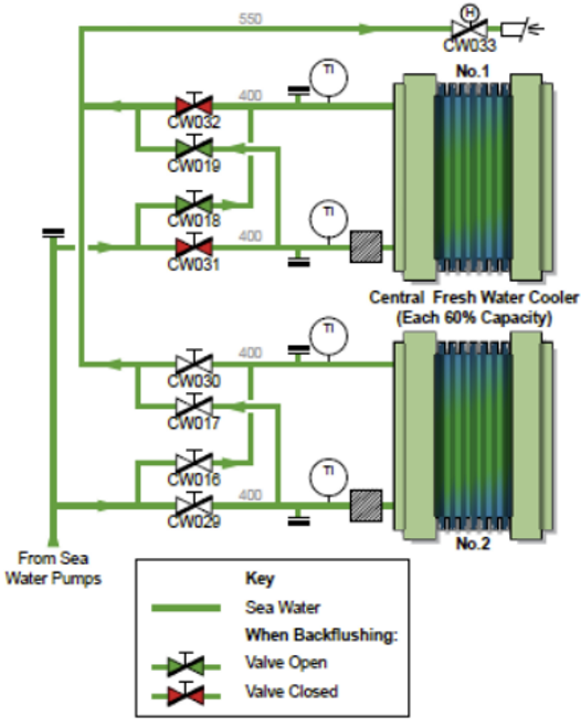 냉각수 출구온도가 설계온도보다 낮을 때는 열교환이 잘 되지 않는다는 의미이므로 back flushing을 수행하되 공정에 충격을 주지 않도록 주의한다. 바닷물이나 냉각수에 딸려오는 이물질이 condenser에 달라붙어 냉각수의 흐름을 저해하거나 열전달 효율을 감소시키므로 T/A전까지 주기적으로 back flushing을 해야 한다.