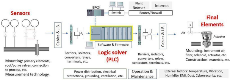Sensor는 BPCS sensor와 독립적으로, switch나 transmitter일 수 있으며, logic solver 또한 BPCS system과 독립적이어야 한다. Final element는 주로 on off valve이거나 motor 혹은 solenoid가 부착된 control valve일 수 있다. 최근의 대형 재난으로 인해 safety system은 더 진화하고 더 까다로워지고 있다.