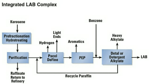 합성세제 원료, 농약 유화제, 잉크용제, 안료 합성용제에 사용되는 LAB는 Pacol process를 통해 만들어진 Linear Olefin에 solid, heterogeneous catalyst를 이용하여 벤젠을 alkylation한 product이다.