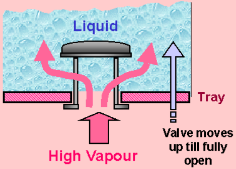 vapor load에 따라 valve는 위 아래로 움직이며 normal flow에서는 valve가 중간 위치에 놓인다. low flow에서는 disk가 아래로 내려가 weeping을 방지한다. low vapor flow에서 지나친 opening이 되지 않도록 valve 자체는 적당하게 무거워야 한다. vapor flow가 증가할수록 disk는 수직으로 올라가며 최대 유량에서는 retaining leg나 cage에 의해 더 이상 올라가지 못하게 고정시킨다. vapor유량과 무관하게 opening이 지나치게 클 경우 weeping이 일어나 performance를 저하시킬 수 있다.