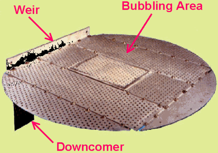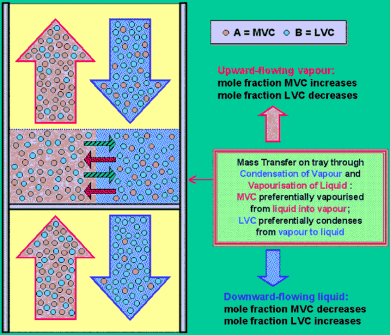 이러한 과정에서 vapor는 light 성분이 농축되며 liquid는 heavy성분이 농축이 된다. 일반적으로 feed tray를 기준으로 상부는 rectifying section이라고 하며 하부는 stripping section이라고 한다. tray에서의 V/L contact의 예를 아래와 같다.