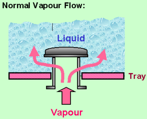 bubble cap tray는 built-in liquid seal인 riser가 있어서 vapor유량이 적어도 liquid drainage를 방지한다. 즉, 가장 큰 장점으로 tray위에서 liquid를 holding하기 위해 올라오는 vapor의 일정 유속 이상으로 유지할 필요가 없다.
