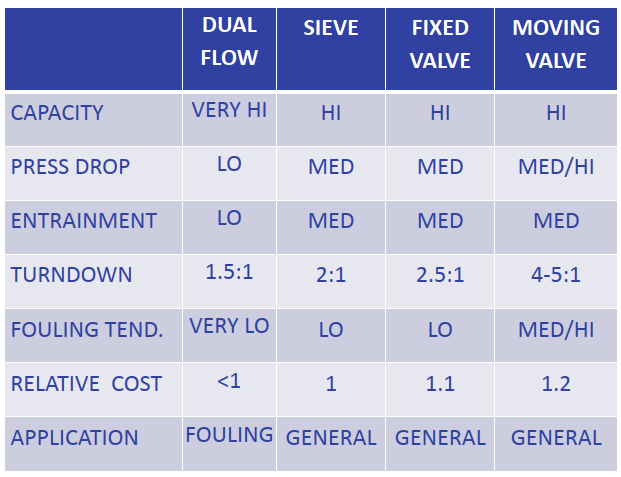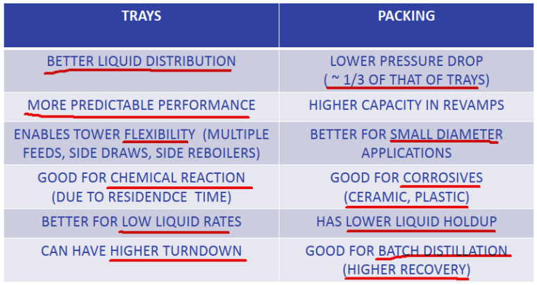 Tray와 packing중 공정에 적합한 설계를 적용하기 위해서는 capacity, efficiency, pressure drop, fluid properties, hold-up, budget 등 factor를 검토해야 한다. 기본적인 선정 기준은 비용이지만 기술적 장단점에 따른 분석을 통해 선택할 수도 있다.