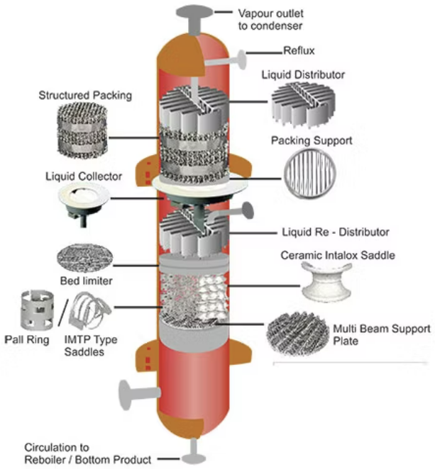 기액 접촉을 위한 Tray column internal로는 sieve, valve, bubble cap 등이 있다. 반면 packed column의 packing은 크게 random, structured type이 있고, 이중 random packing은 Raschig ring, pall ring, berl saddle, intalox saddle이 있고, structured packing으로는 proprietary item들인 mellapak, flexi grid, sulzar type등이 있다.