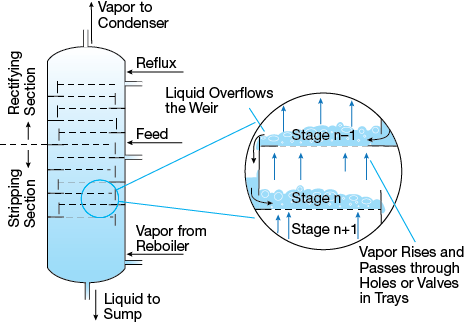 Tray tower는 V/L 물질전달을 위해 liquid hold-up을 제공하며 이를 위해 weir를 각 tray 끝부분에 설치하여 액체가 일정 높이를 유지한 채 tray를 통과하면서 아래에서 올라오는 증기와 접촉된다.