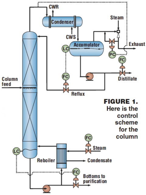 아래 figure1에 따르면 distillate flow rate의 set point는 운전원이 설정하고, reflux유량은 accumulator level에 의해 cascade운전을 한다. reboiler heat source인 steam유량의 set point는 운전원이 설정하고 bottoms 유량 역시 column bottom level에 의해 cascade제어되고 있다. column overhead압력은 vacuum ejector spillback을 통해 제어되며 이 공정에는 온도제어가 없다.