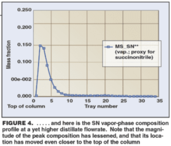 simulation결과 distillate유량이 증가하면 SN은 더 완벽히 퍼지가 된다. 아울러 column내 SN의 기상 조성 profile을 보면 distillate유량이 증가함에 따라 column내 bubble이 위쪽으로 이동했음을 알 수 있다. (Figures 3 and 4)