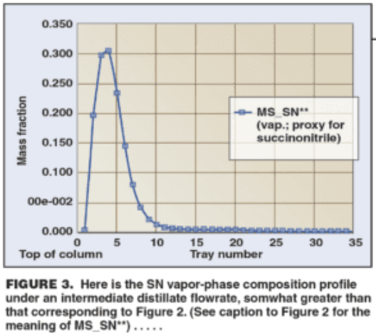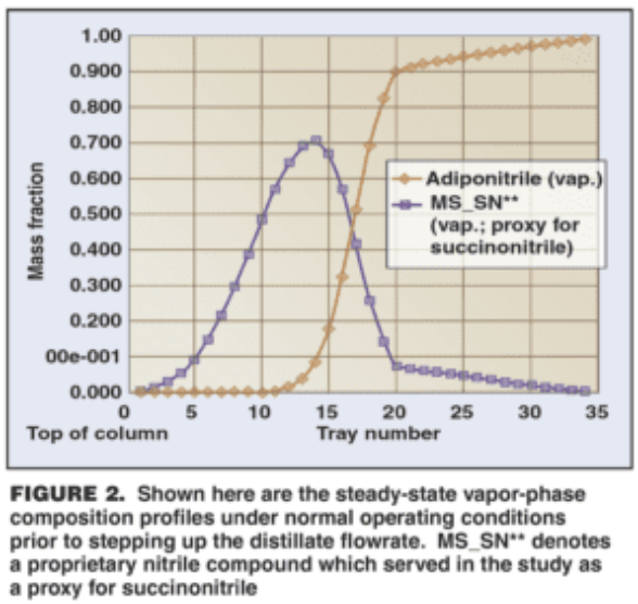 아래의 예는 ADN (adiponitrile) 생산의 마지막 단계로서, crude ADN stream으로부터 low boiling point들인 SN (succinonitrile)과 AN (acrylonitrile)을 제거하기 위한 stripper column이다.