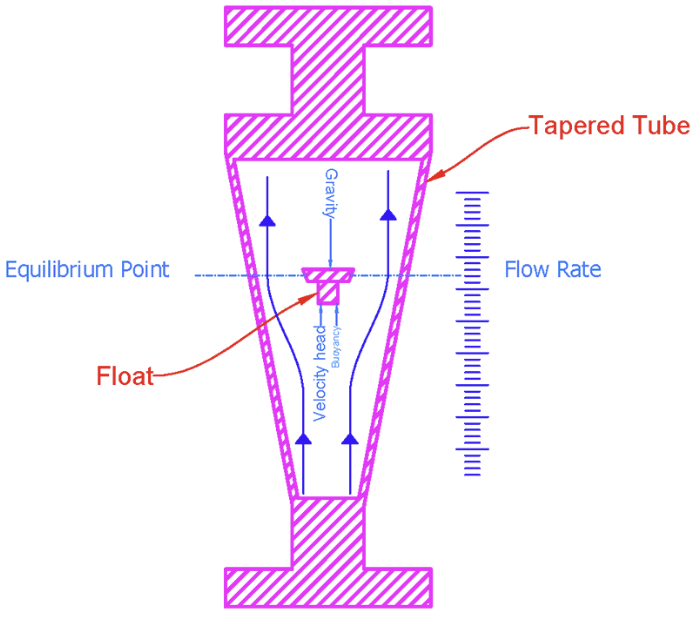 유체의 흐름은 테이퍼형 관의 플로트를 떠오르게 하고 유체가 통과하는 영역을 증가시킨다. 유량이 커지면 플로트의 높이도 올라가며, 플로트의 높이는 유속에 직접적으로 비례한다. 액체의 경우 플로트는 액체의 부표와 유체의 속도 헤드의 결합으로 상승하며, 기체의 경우 부표는 무시해도 되며 플로트는 속도 헤드에만 반응한다. 플로트는 관 안에서 유속 그리고 플로트와 관의 벽면 간의 고리영역이 비례하여 상승 및 하강한다.