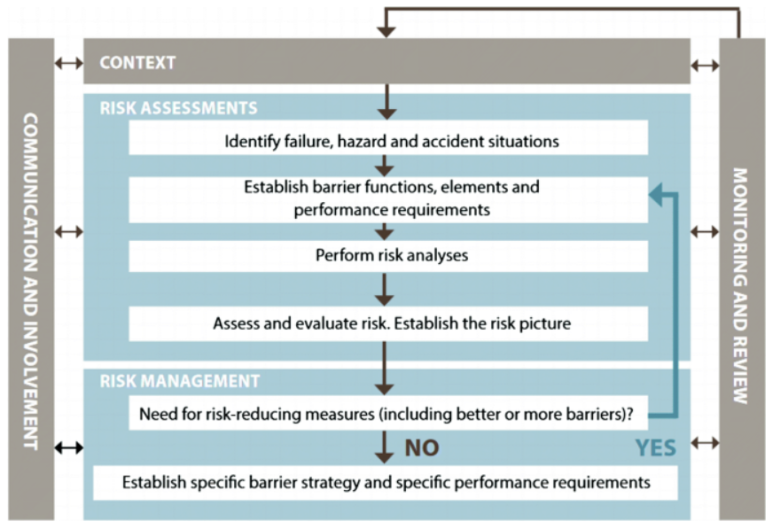HAZID, HAZOP, LOPA, bowtie analysis와 같은 표준 위험성 평가 방법을 통해 위험요인을 인지하고 결과를 예측하며, 사고 시나리오를 방지하거나 완화하기 위한 barrier는 documented된다. 이러한 접근방식을 통해 위험요소가 적절히 관리되고 있는지를 보여주며, 설비의 lifecycle동안 받아들일 수 있는 수준으로 지속적으로 잘 관리가 되는지에 대한 확신을 갖도록 해야한다.