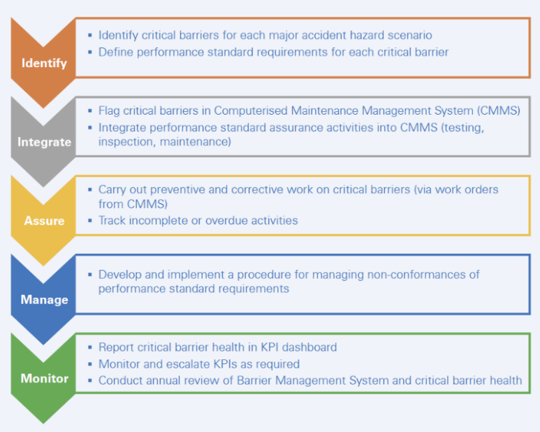 잠재적인 사고를 야기할 수 있는 주요 위험이 무엇이며 이러한 위험을 control하기 위해 의지해야 할 barrier (safeguard)는 무엇이며, 이러한 barrier가 요구되어질 때 설계된대로 작동할 지 확신할 수 있어야 한다. 이러한 critical barrier는 asset의 전 주기 동안 available하고 effective해야 한다.