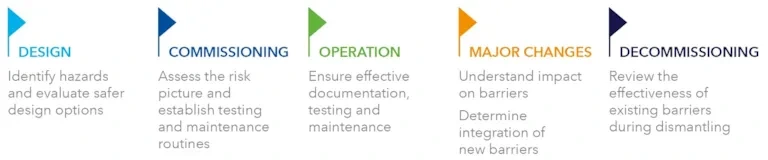 barrier management는 설계단계 및 설비의 전주기 동안 지속되는 공정으로서, 아래 모든 단계에서 barrier manegement는 작동되어야 하고 평가되어야 한다.