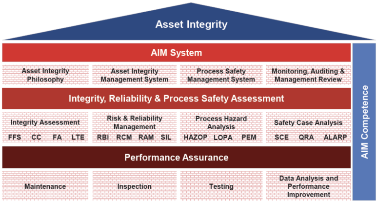 반면 integrity management란 보다 큰 개념의 관리방식으로서 system이나 운전절차, 조직이 사고를 방지하기 위해 그들의 기능을 효율적으로, 효과적으로 수행하도록 하며, 이를 위해 integrity menagement는 다양한 위험성 평가 및 관리로 구성되며 여기에는 barrier manegement, integrated design reviews (IDR), bow-tie analysis, risk-based maintenance, obsolescence management등이 포함된다.
