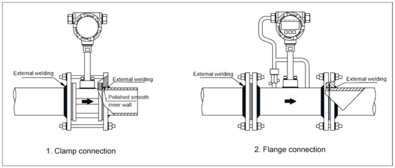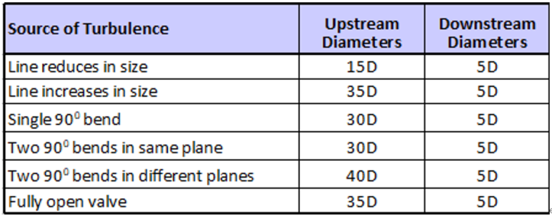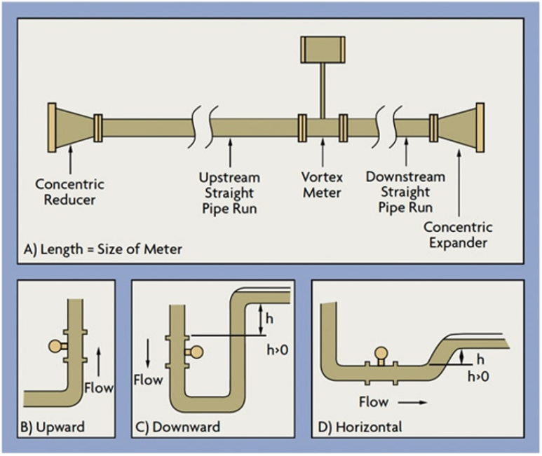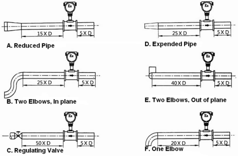 Vortex 유량계 설치관련 최적의 성능을 유지하기 위해 유량계 입구와 출구에 유체의 flow pattern을 균일화할 필요가 있다. 전단에 reducer, elbow, valve등이 있을 경우 충분한 이격 거리를 유지해야 하며, 후단에도 적어도 5D 이상의 직관부를 설치해야 한다.