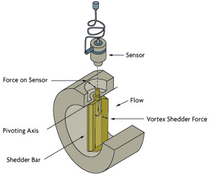 Vortex 유발을 일으키는 shedder bar 혹은 bluff bar가 유로 내부에 설치되어 소용돌이를 잘게 만들어낸다. 이 소용돌이는 압력센서에 의해 감지되어 유량으로 전송된다.