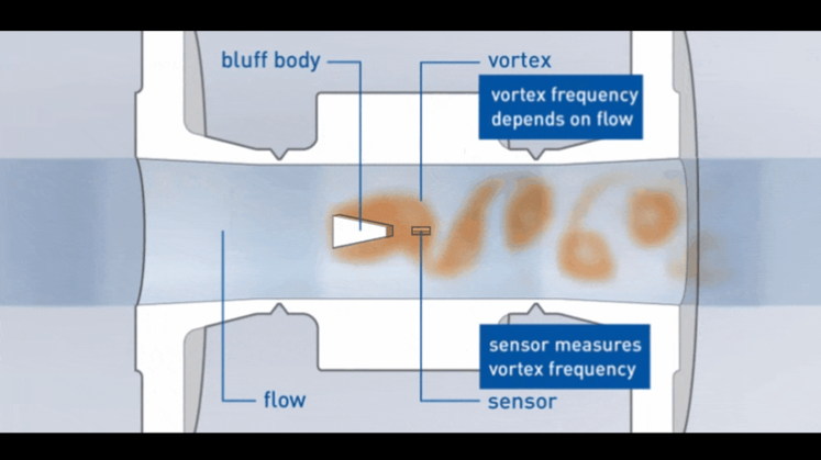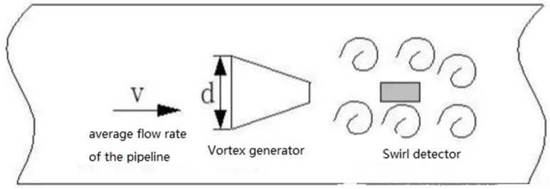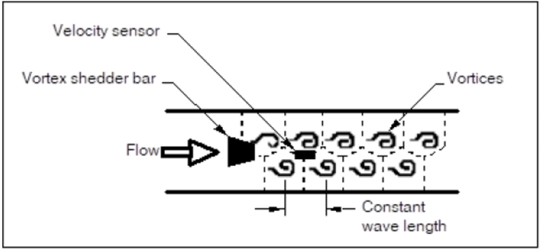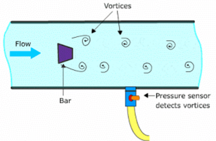 Bluff body를 통과한 후 나타나는 소용돌이로 인해 고압, 저압이 나타나며 이 압력 차이는 정확히 소용돌이의 주파수와 일치한다. 소용돌이 사이의 거리는 흐름의 유량에 상당하여 흘러가는 소용돌이 수를 계산하여 유량을 측정한다. 속도가 너무 느릴 경우 단면적을 줄여서 극복할 수 있으며 온도 sensor도 설치하여 온도보상에 이용할 수도 있다.