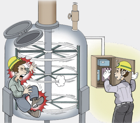 - 용기내부 등 작업자의 위치가 쉽게 확인되지 않는 정비작업을 하는 경우에는 반드시 전체 근로자에게 공지하여 다른 근로자의 설비가동을 예방하여야 함.