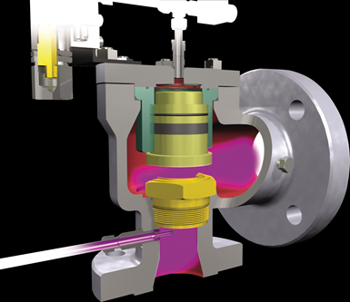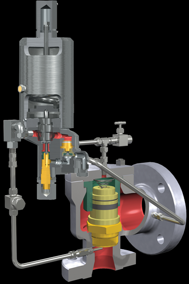 main valve disc가 seated position으로부터 pop action을 하여 100% open을 한다. 과압조건이 해소되면 pilot valve를 통해 main valve disc top (dome)으로 process pressure가 전달되어 main valve disc는 reseat하게 된다.