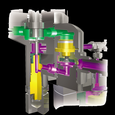아래 그림은 inlet pressure가 증가할수록 pilot piston이 storke하고 dome pressure로부터 main valve inlet pressure를 sealing off하여 더 이상 main valve inlet압력이 영향을 주지 않게 된다. 동시에 pilot는 vent seal을 열어서 modulator piston 아래방향으로 dome pressure를 배출한다.