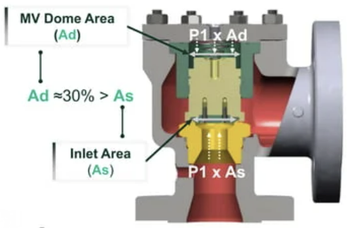 아래 그림은 main valve inlet으로부터 system 압력이 pilot를 통해 dome area로 전달이 되어 process압력과 disc top의 압력이 equalizing되며 disc top의 면적이 seating surface의 면적보다 크기 때문에 net downward force가 작용하여 main valve는 tight하게 closed하게 된다.