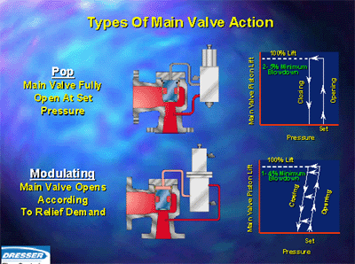 pop action과 차이는 main valve disc위에서 시스템 압력을 유지하면서 배출량을 adjusting하는 modulating action을 한다. 즉, 시스템 압력이 증가하면 pilot valve를 통한 venting때문에 closing force가 감소하여 main valve가 점점 열리게 된다. 그러나 이 과정에서 main valve disc의 실제 lifting은 system overpressure condition에 따라 positioning이 결정되므로 순간적으로 작동하는 pop action인 100% opening과는 운전상 차이가 있다. modulating action을 통해 공정유체의 배출을 줄이고 아울러 emission 및 noise도 줄일 수 있어서 개선된 운전효율을 유지할 수 있다.