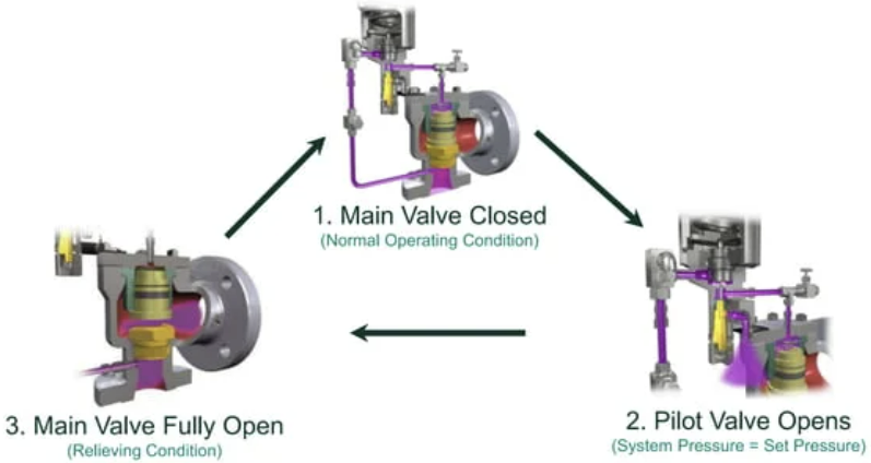 pilot valve는 시스템 압력을 sensing후, 이 압력을 이용하여 main valve disc에 미치는 closing force를 control하면서 운전이 된다. main valve inlet압력이 증가할수록 dome과 seat에서의 area비 차이에 의해 pilot valve가 열리기 전까지 closing force는 더 커지게 되어 main valve는 tightness가 더 커지게 된다. set pressure에 도달되면 pilot valve의 spring에 의해 main valve dome 상부의 가스가 exhaust를 통해 배출되어 결국 main valve가 열리게 된다.