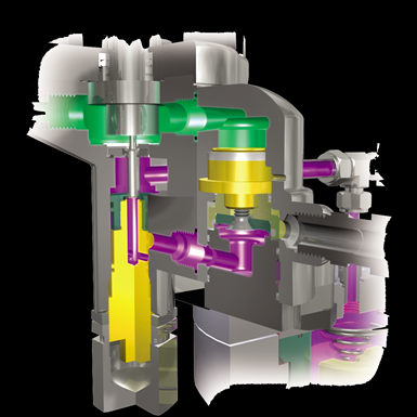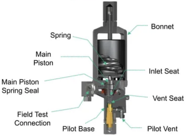 set pressure에 도달되면 pilot내 spring에 의해 작은 피스톤이 아래로 움직여 main valve piston top에 미치고 있는 압력을 pilot exhaust를 통해 relieving하게 된다. 이에 따라 main valve dome내의 압력이 대기로 빠지면서 main valve가 열리게 된다.