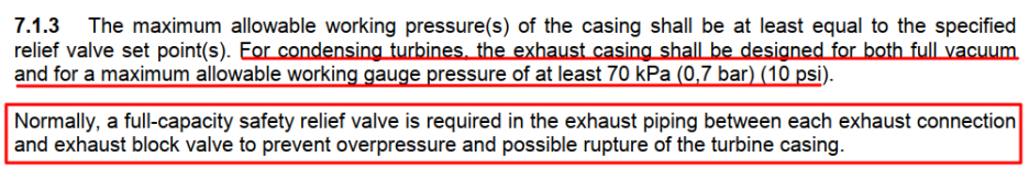 API611을 적용하는 general purpose steam turbine의 경우, 위에 언급된 API612 requirement가 없어서 가끔 turbine exhaust line상 safety valve가 누락된 경우가 있으니 vendor 설계를 면밀히 검토해야 한다. (후단 밸브 blocked상태에서 casing 과압이 걸려 rupture가 발생한 사고가 있었음.)