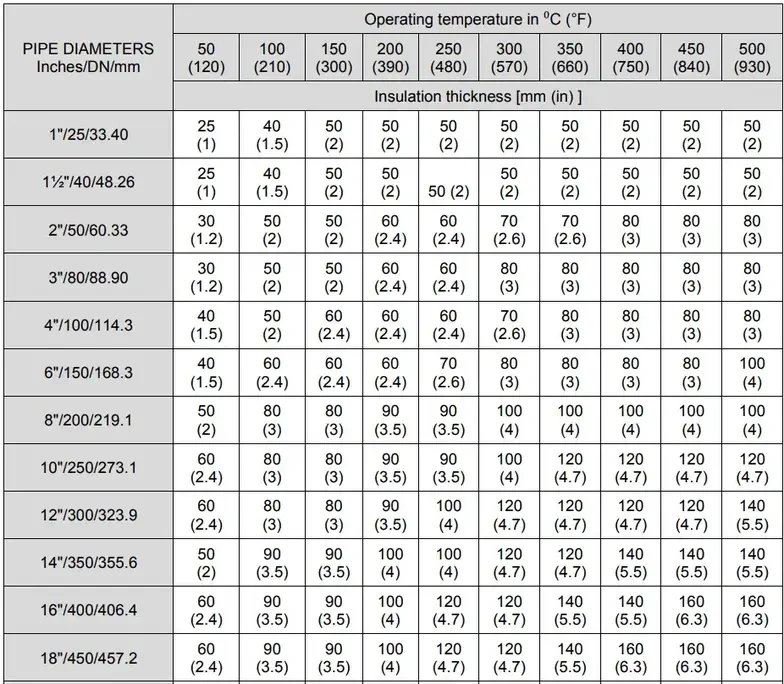 Typical Pipe Insulation Thickness Chart for Hot Insulation
