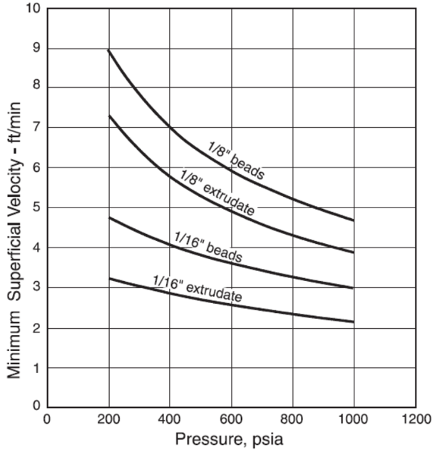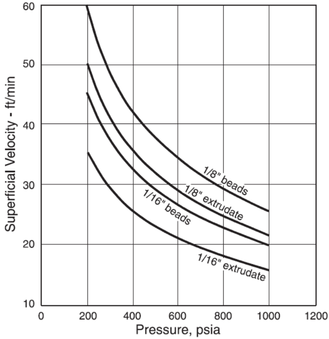 재생시의 재생가스의 superficial velocity는 최소 필요 차압인 0.01psi/ft를 유지할 수 있는 유속보다 작아서는 안된다. 가스 조성과 온도 및 bed 길이당 차압을 0.01psi/ft로 가정하여 아래와 같은 plot을 이용할 수 있다. 만약 계산된 속도가 이 값보다 작다면 재생가스 유량을 속도 비율만큼 늘리고 반면 재생 시간은 속도 비율만큼 줄인다.