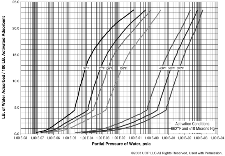 Saturation zone에서 molecular sieve는 sieve 100lb당 수분 13lb를 흡착할 수 있으며 이는 3~5년의 life time에서의 정보이며, 새로운 molecular sieve는 20% 가까이 흡착할 수 있다.
