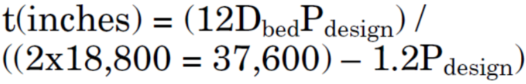 Vessel ID에 따른 ASME VIII기준 두께는 아래와 같다. 이는 SA516 Grade 70 steel이 650F 및 welded joint efficiency 1에서 최대 허용되는 tensile stress 18,800 psi기준이며, 600F에서는 19,400psi에 해당된다. 설계압력은 MOP의 110%에서 고려한다.